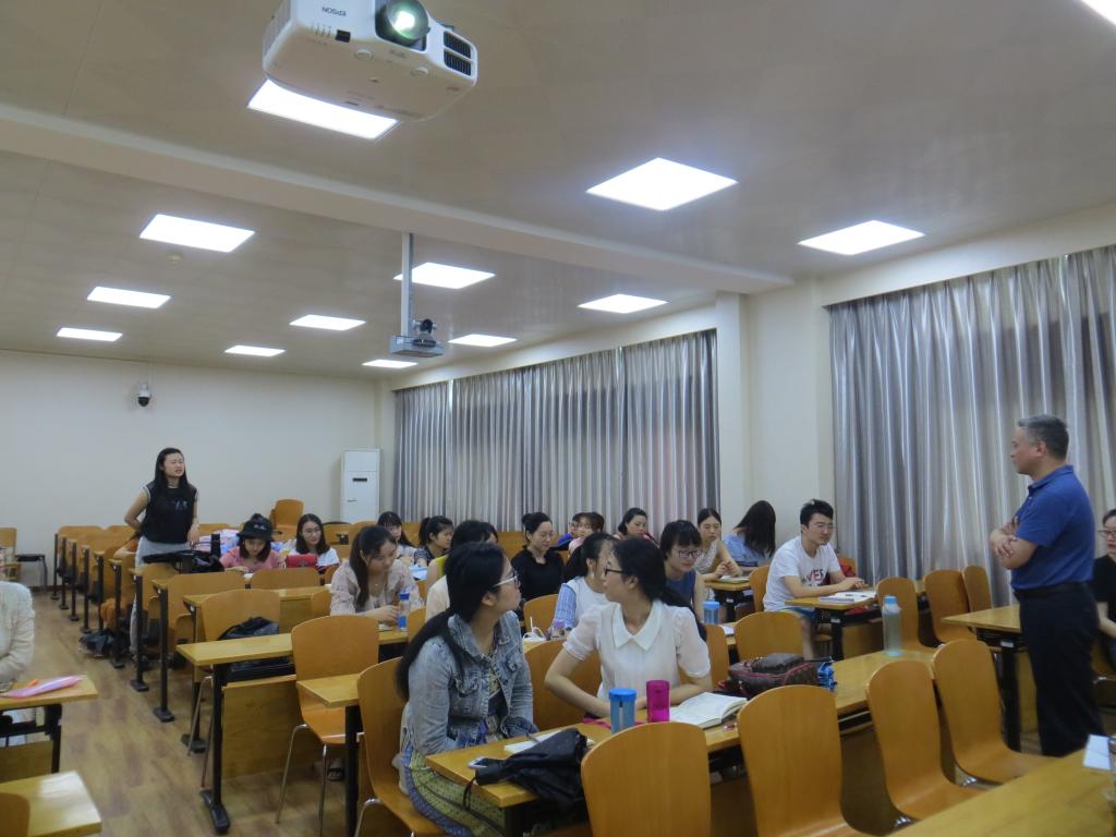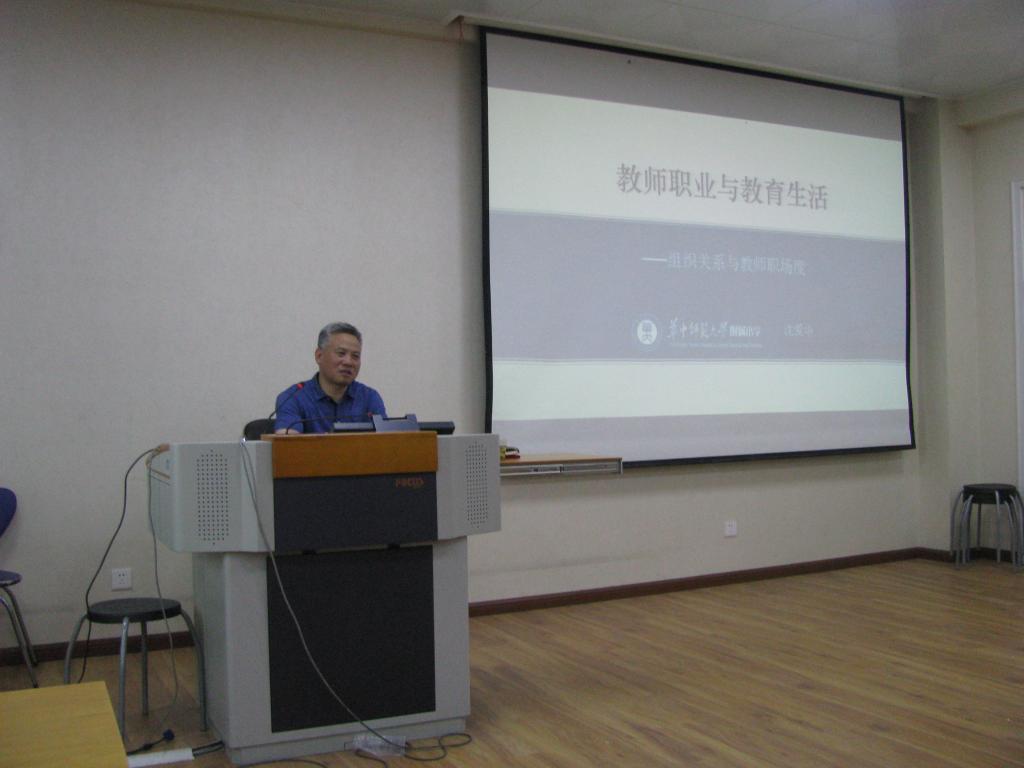 沈校长认为,教育不应有“优质教育”与“劣质教育”之区分,而应以“美好的教育”为追求,要用美好的教育来影响学生,来勾画未来美好的生活。沈校长辅以不同时期华中师范大学附属小学师生生活的照片,分析了不同时代教师的生活方式:五十至七十年代的教师更像知识分子,虽然清贫,但却清高、善于钻研;八、九十年代的教师,独立办公,安静备课,钻研教学方法;新世纪以来,教育生活互动感、色彩感强,师生关系更加民主、平等。他说,“教师不仅是要走上职场,而是要创造美好的教育生活。” 沈校长结合自己丰富的人生经历谈到,教师要处理好组织关系,才能走好职业生涯场;教师要处理好师生关系,才能体会到职业尊严感;教师要处理好家校关系,才能体会到职业魅力;教师要处理好同行关系,才能体会到职业幸福感;教师要处理好同自我的关系,才能有进步,体会到职业生命力;教师要认清自己和时代、国家的关系,才能树立起远大的职业理想。随后,沈校长还为同学们介绍了教师职业生涯的成长历程,勉励大家要树立理想,不断努力,做学生喜欢、同行佩服、家长尊重、校长认可的好老师。